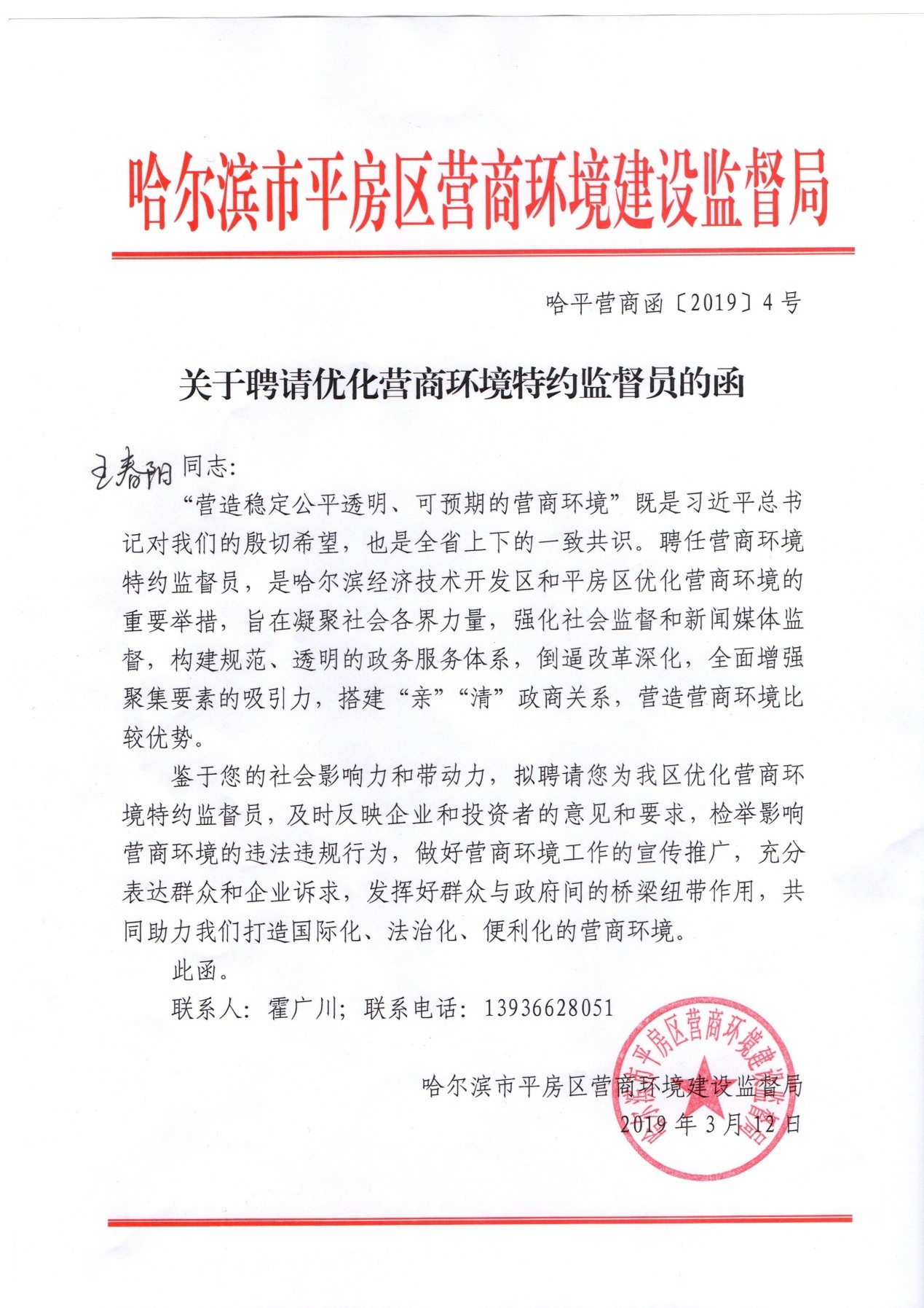 Recently, Harbin Pingfang District Business Environment Construction Supervision Bureau has appointed Mr. Wang Chunyang, Vice-President of Dongsheng, as a special supervisor for Pingfang District to strengthen social supervision and media supervision, build a standardized and transparent government service system, and build a "clear" and "worm" government-business relationship. The purpose is to timely reflect the opinions and requirements of enterprises and investors, to report illegal and irregular acts affecting business environment, to publicize and promote a good business environment, to fully express the demands of the masses and enterprises, and to create an international, politicized and convenient business environment.