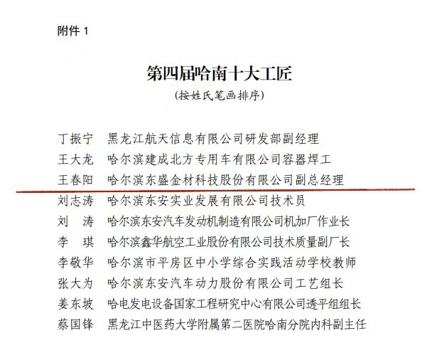 2021年恰逢中國(guó)共產(chǎn)黨成立100周年,為深化黨史教育實(shí)踐活動(dòng),貫徹落實(shí)習(xí)近平總書記在全國(guó)勞動(dòng)模范和先進(jìn)工作者表彰大會(huì)上的重要講話,進(jìn)一步弘揚(yáng)勞模精神、勞動(dòng)精神、工匠精神,努力營(yíng)造勞動(dòng)光榮的社會(huì)風(fēng)尚和精益求精的敬業(yè)風(fēng)氣,激勵(lì)廣大職工爭(zhēng)做新時(shí)代的奮斗者,哈經(jīng)開區(qū)黨工委、管委會(huì),平房區(qū)委、區(qū)政府于近期舉辦第四屆“哈南十大工匠”評(píng)定工作。經(jīng)評(píng)審,授予東盛集團(tuán)副總經(jīng)理王春陽(yáng)“哈南十大工匠”榮譽(yù)稱號(hào)。